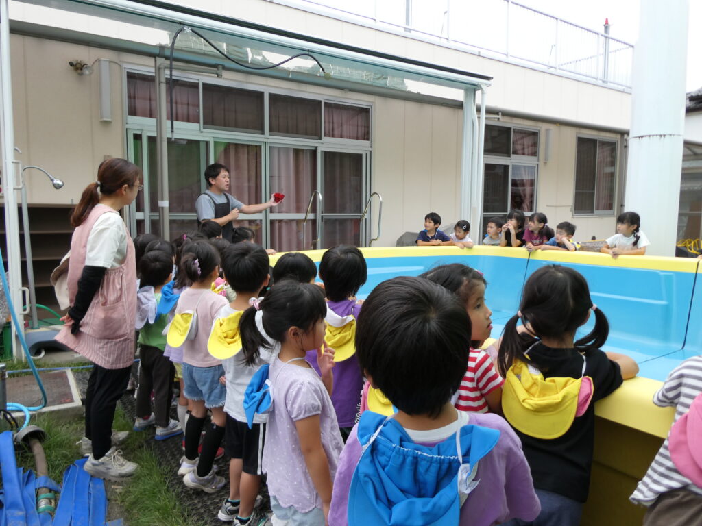 この夏いっぱい楽しんだプール遊びも終了となりました。塩・お米・お酒でプールをお清めをし、