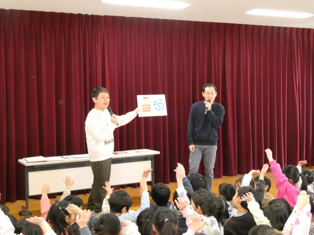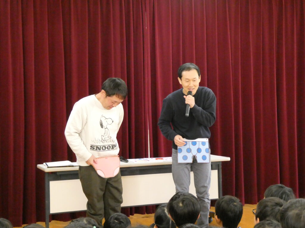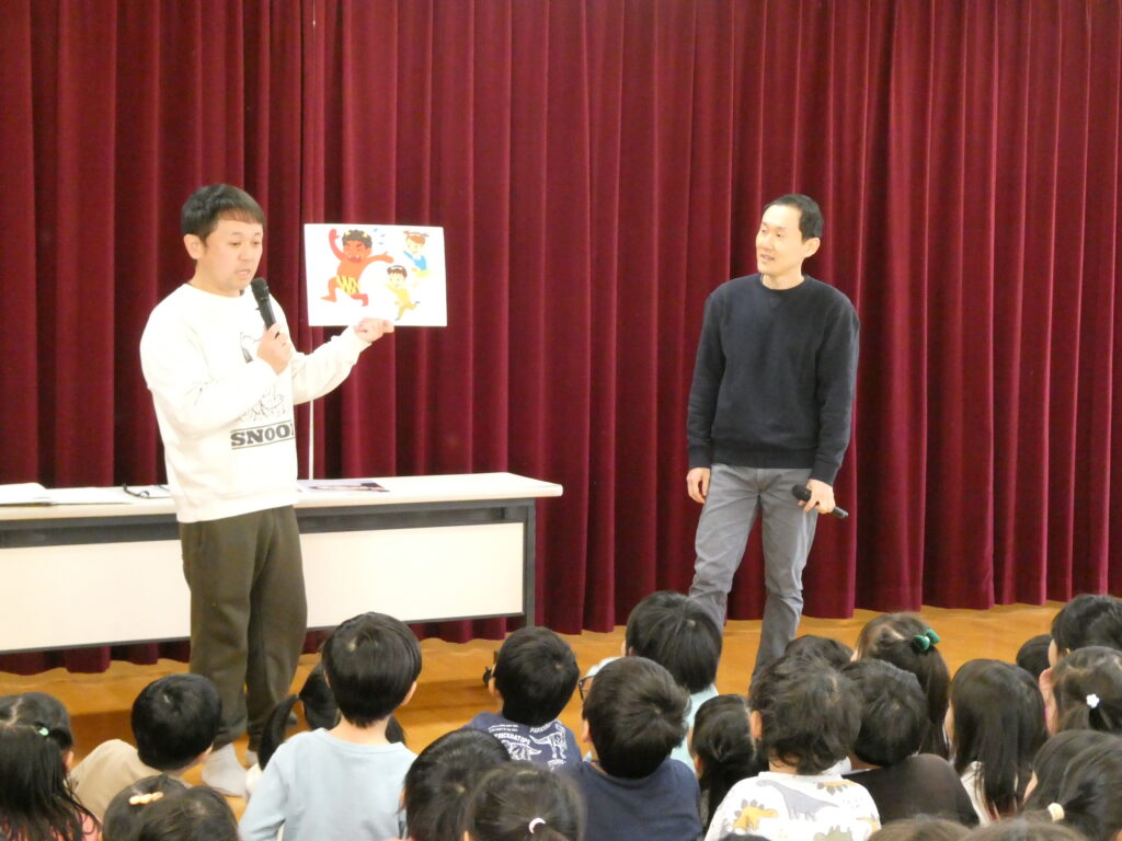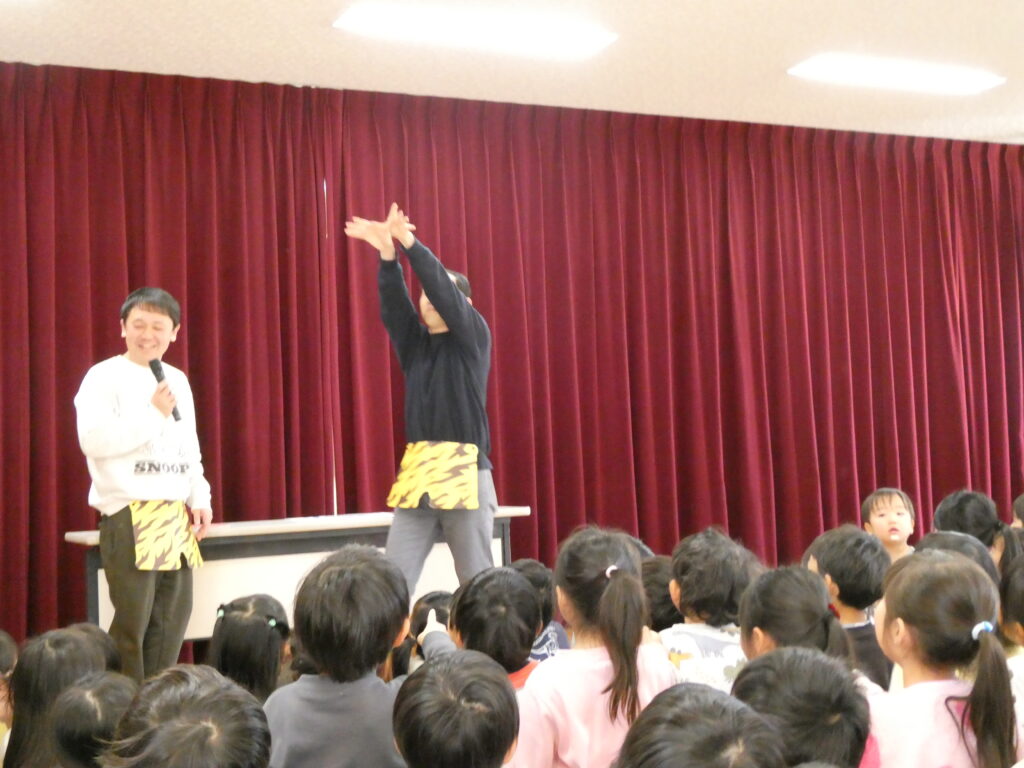 今月のお楽しみは、節分間近ということで、アヒル倶楽部が登場し「鬼のパンツ」の手遊びをみんなで行いました。アヒル倶楽部の掛け合いに子どもたちからはたくさんの笑顔や笑い声が聞こえてきました😊