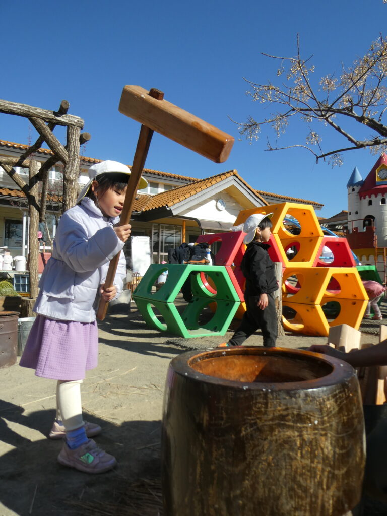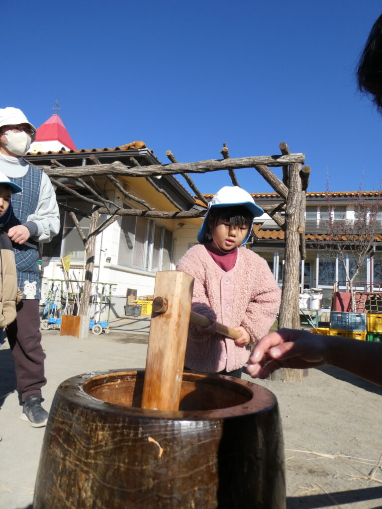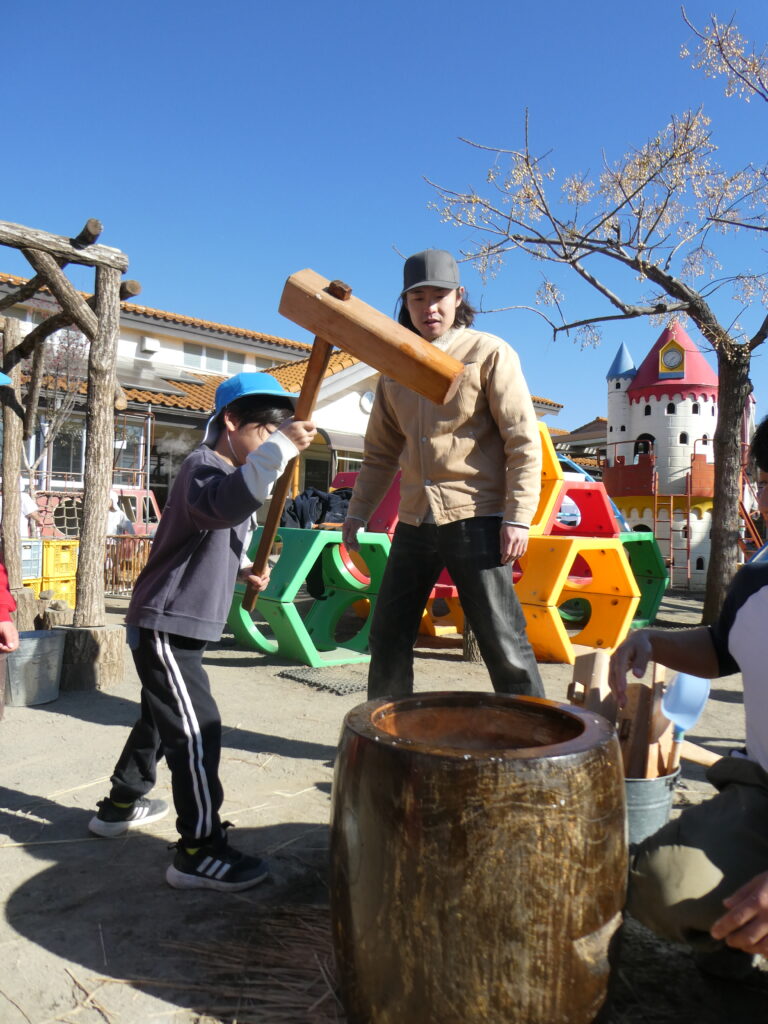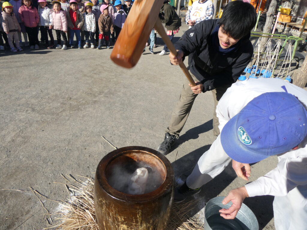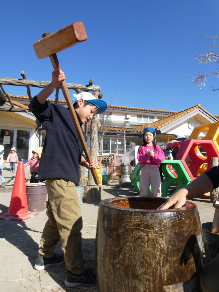 もち米を園庭でふかして、杵と臼を使っておもちをつきました!