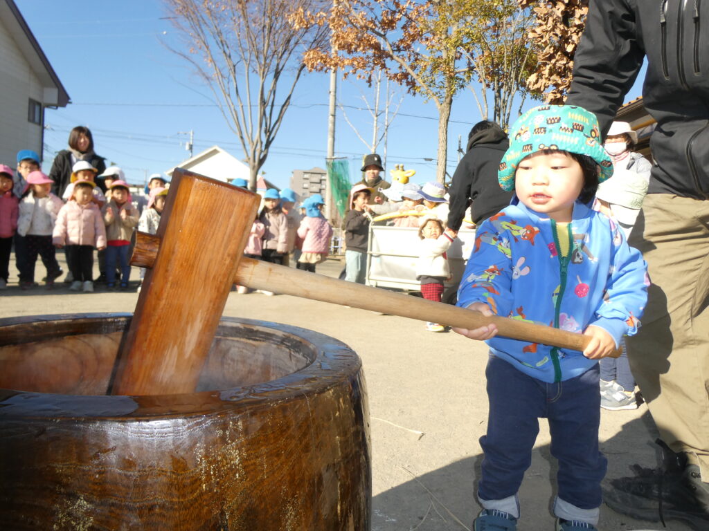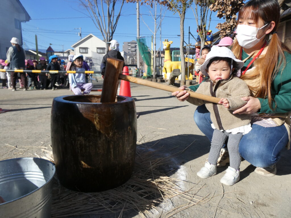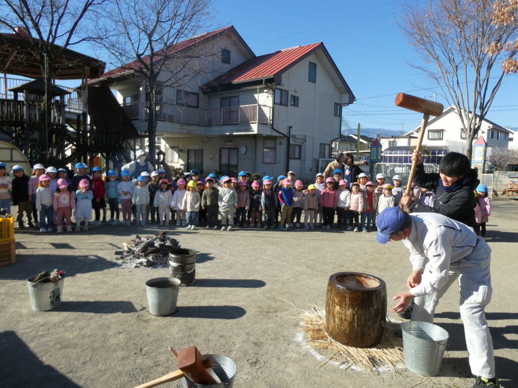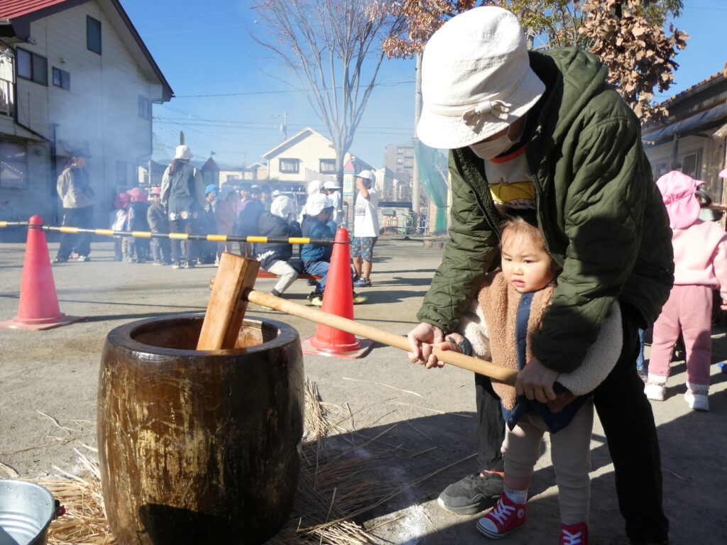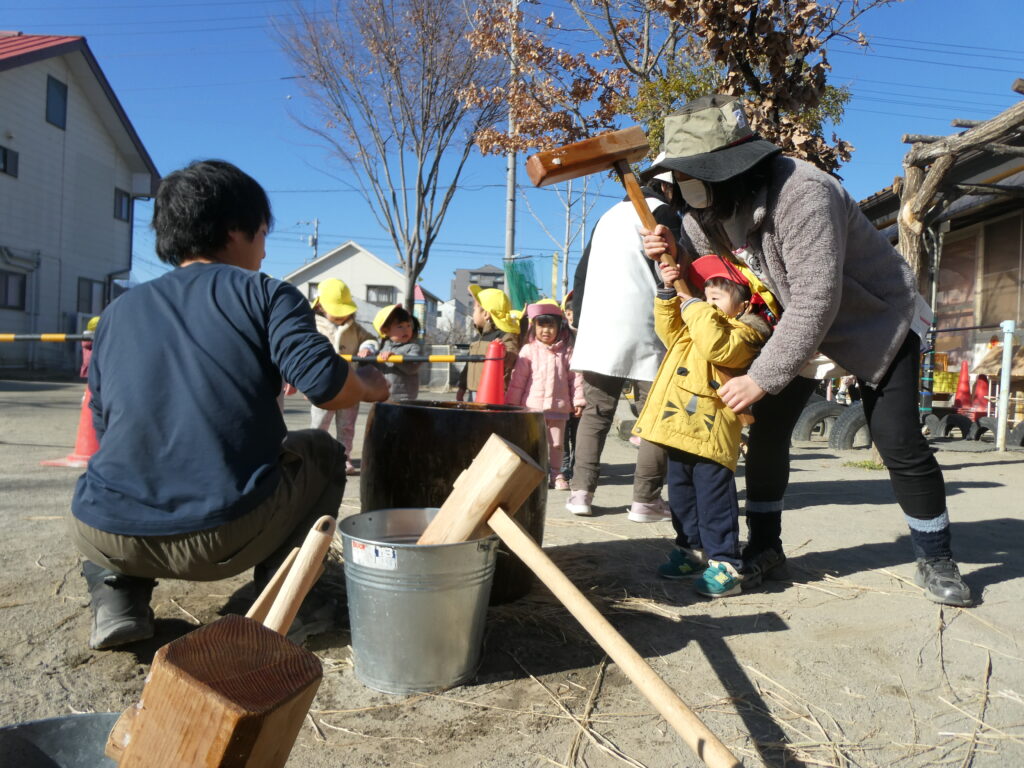 もち米を園庭でふかして、杵と臼を使っておもちをつきました!